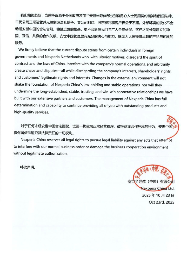 其中提到,为确保安世半导体在全球以及中国市场的业务连续性与管理稳定性,依照中华人民共和国相关法律法规及行政指导精神,安世半导体(中国)有限公司(下称“安世中国”)现就近期荷兰总部单方面免去张秋明先生销售市场部副总裁职务一事,发表如下正式声明:一、荷兰总部相关决定在中国境内不具备法律效力;二、张秋明职务身份保持不变;三、张秋明先生职权范围内的行为代表安世中国;四、安世中国业务运营一切正常,目前,安世中国所有业务活动、生产运营及对外合作均在法律与管理制度框架下有序、正常开展,不受任何外部单方面决定的影响。我们完全有能力确保业务的连续性与稳定性。